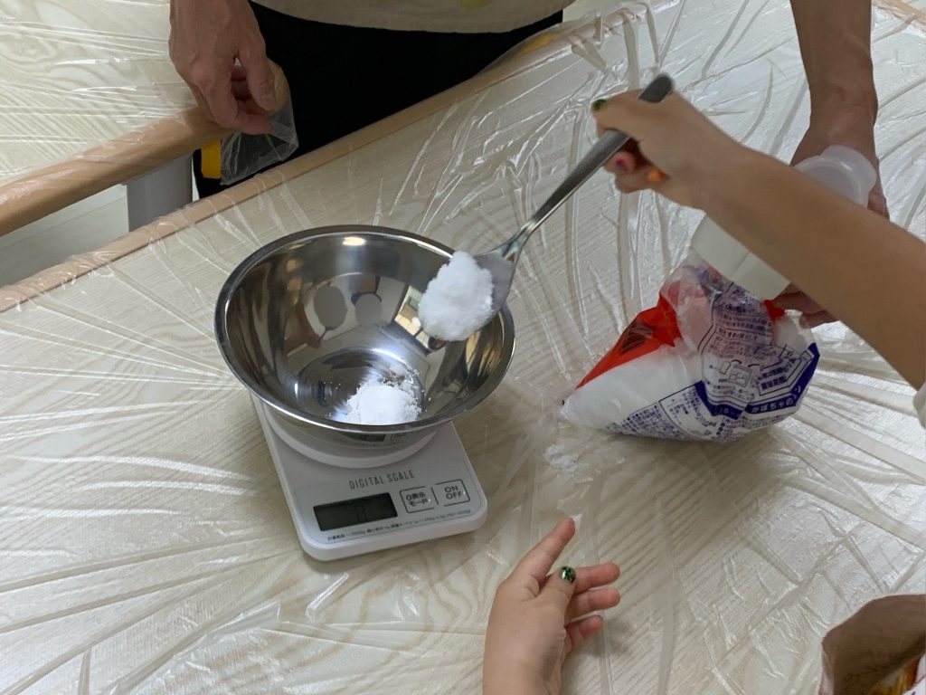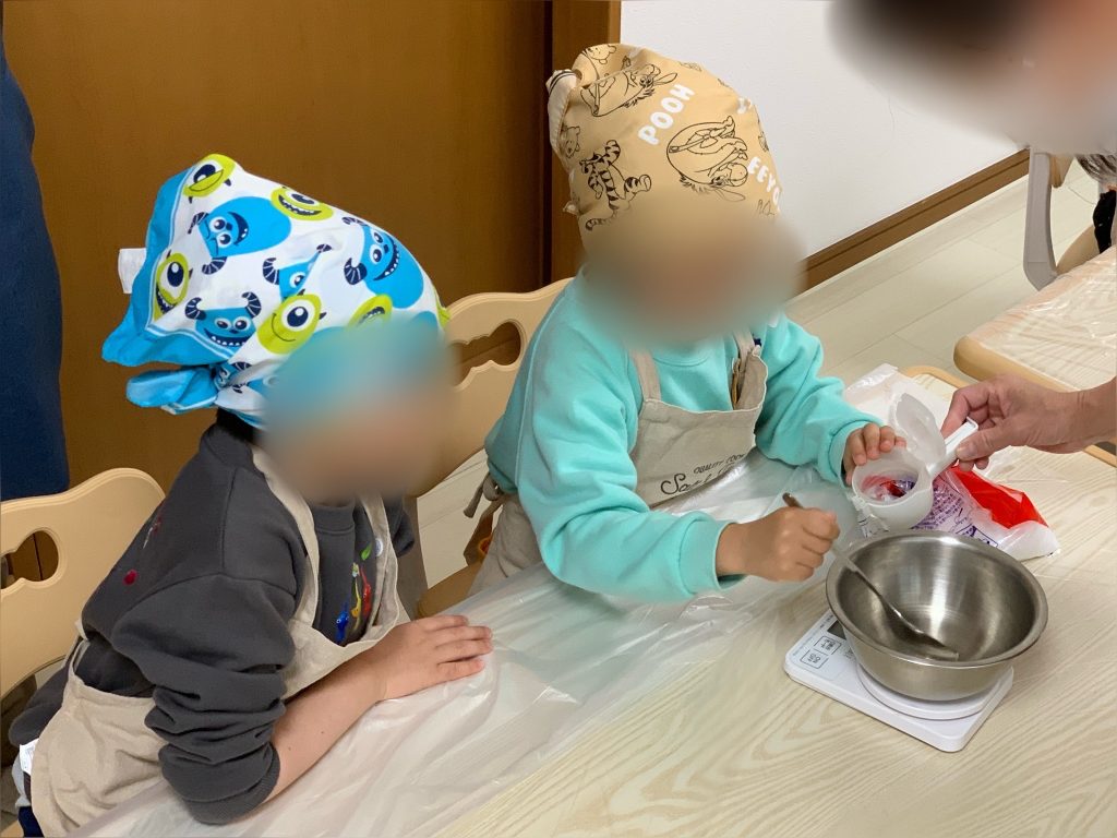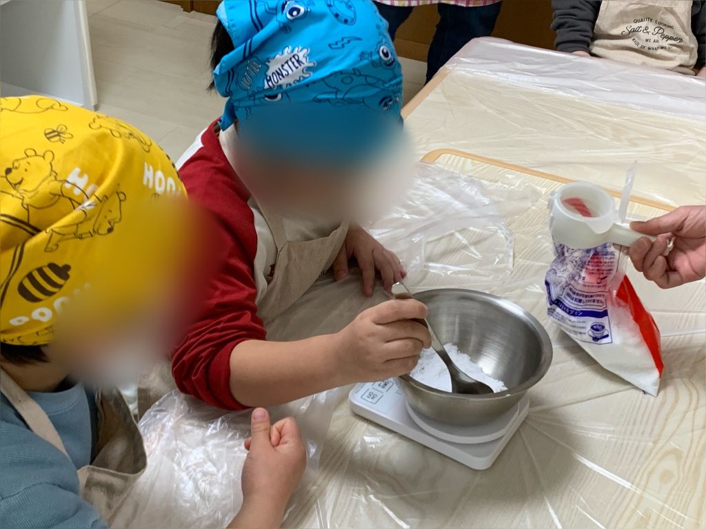 小麦粉と砂糖のグラムを量り、卵を割って、材料を混ぜ、生地を寝かせた後、型ぬきします。本格的ですよね!