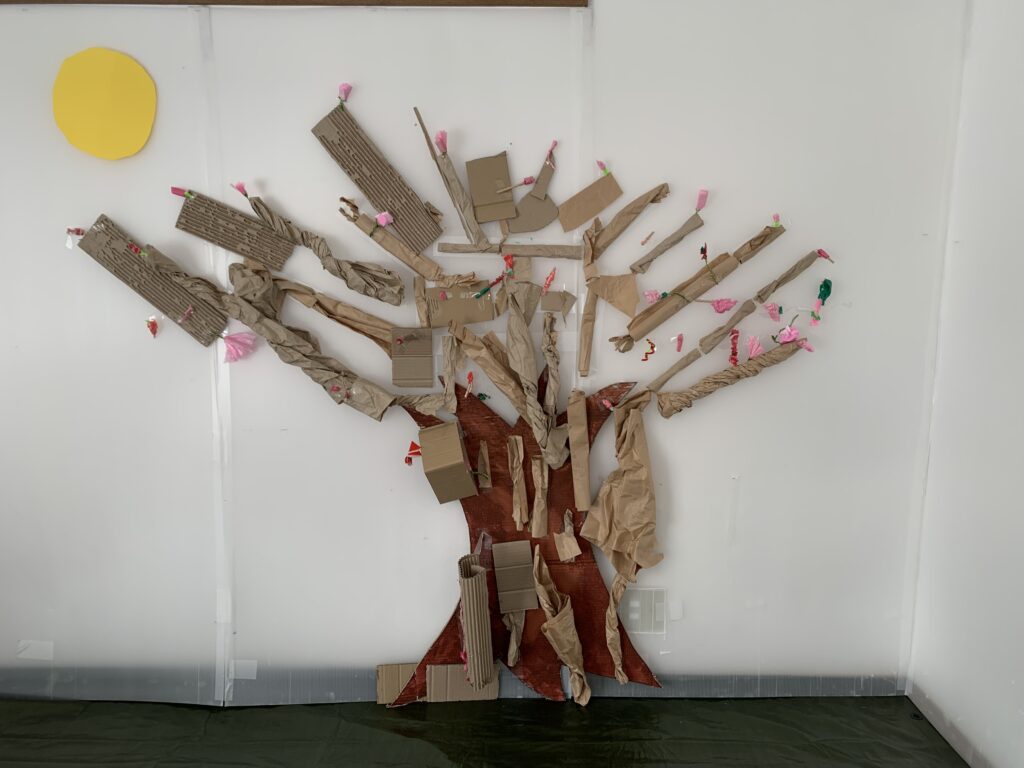 今月は段ボールを切り取った幹に茶色い梱包紙や画用紙、段ボールを半分にした物等を使って枝を付けてもらいました。